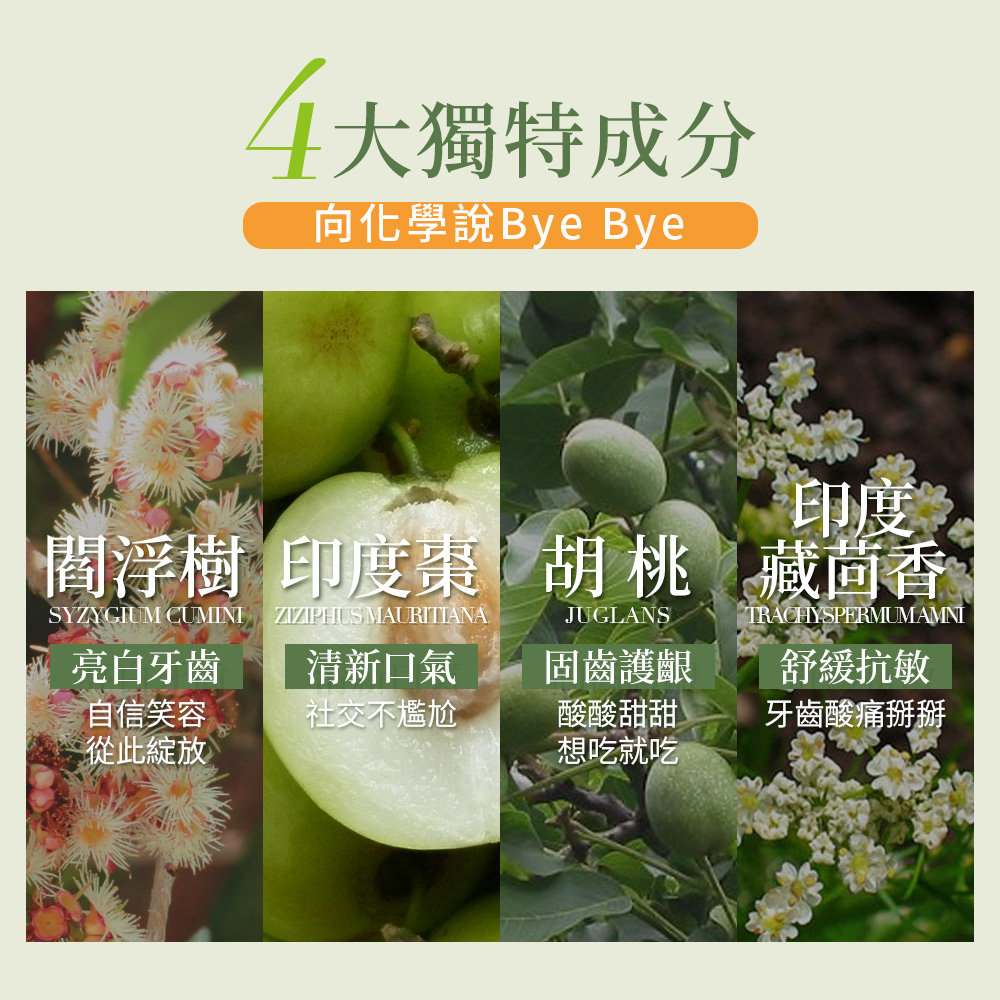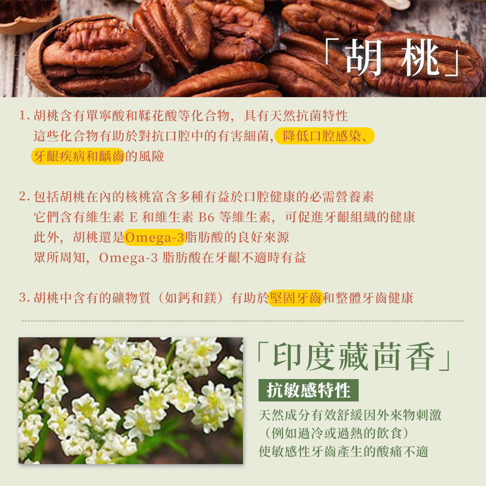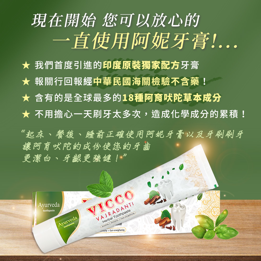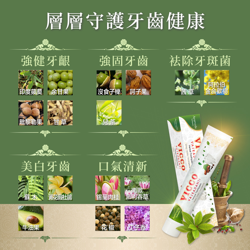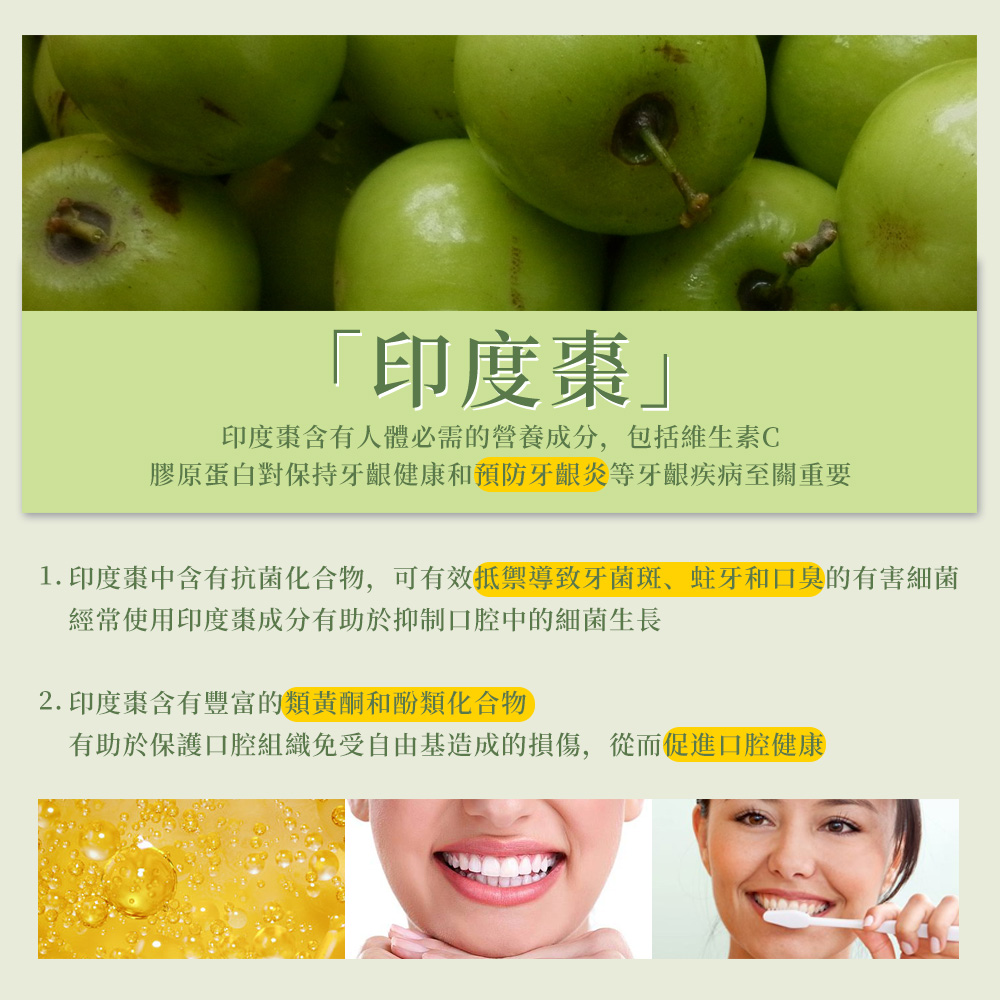 用途:18種印度阿育吠陀草本植物提煉,配合正確刷牙習慣,可降低牙周病發生率,幫助清除牙菌斑,維護牙齒和口腔健康。