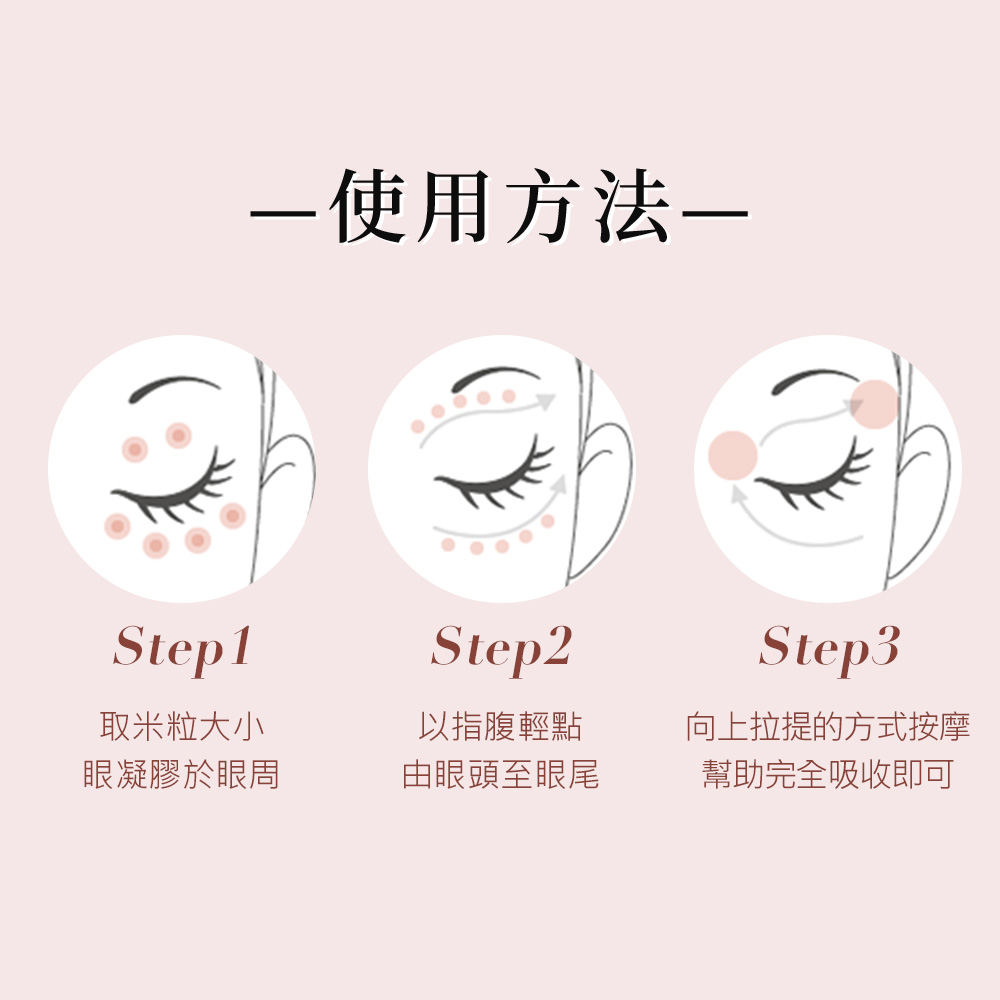 用 法:每日早晚使用,臉部洗淨後請取適量塗抹於眼部肌膚,可加強眼週及唇週,吸收即可。