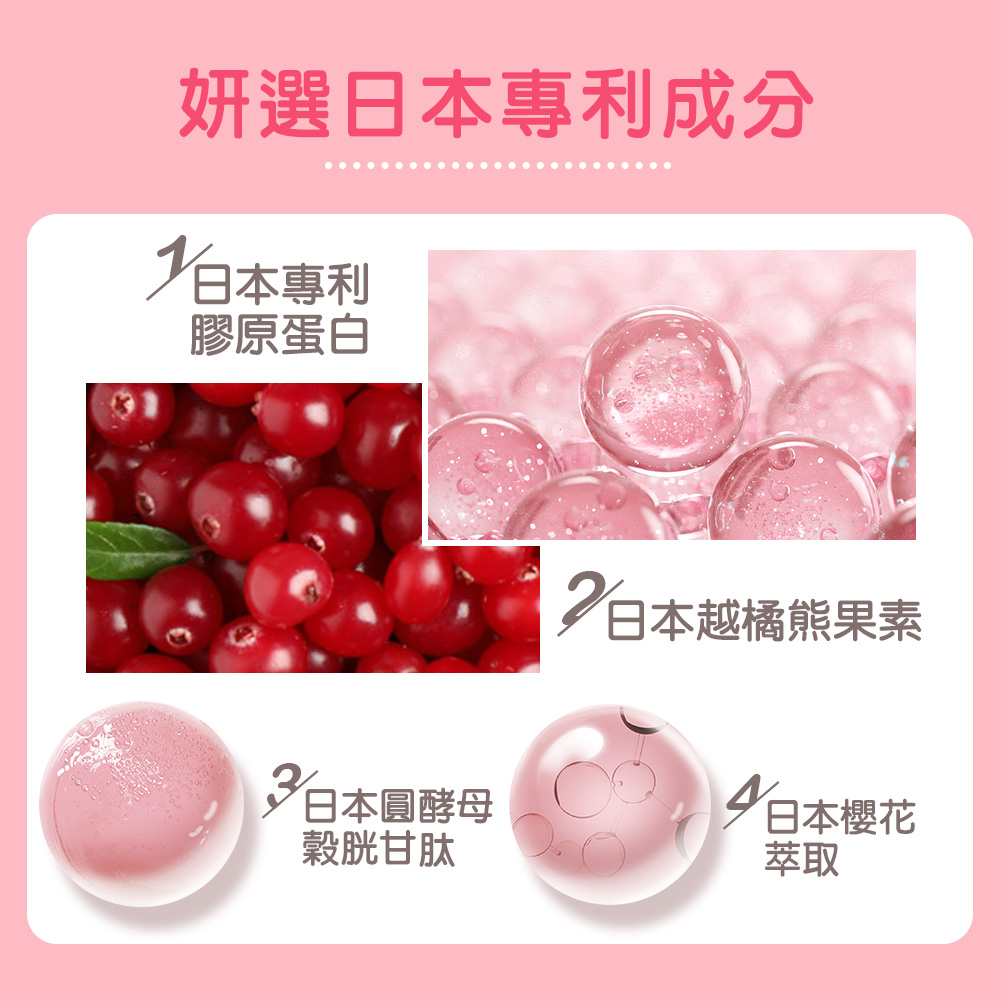 魚膠原蛋白粉、即溶蔓越莓果汁粉、難消化性麥芽糊精、乳糖、DL-瓶果酸、二氧化矽、蔓越莓粉、越橘萃取物、櫻花萃取物、穀胱甘肽….(詳見外盒包裝)