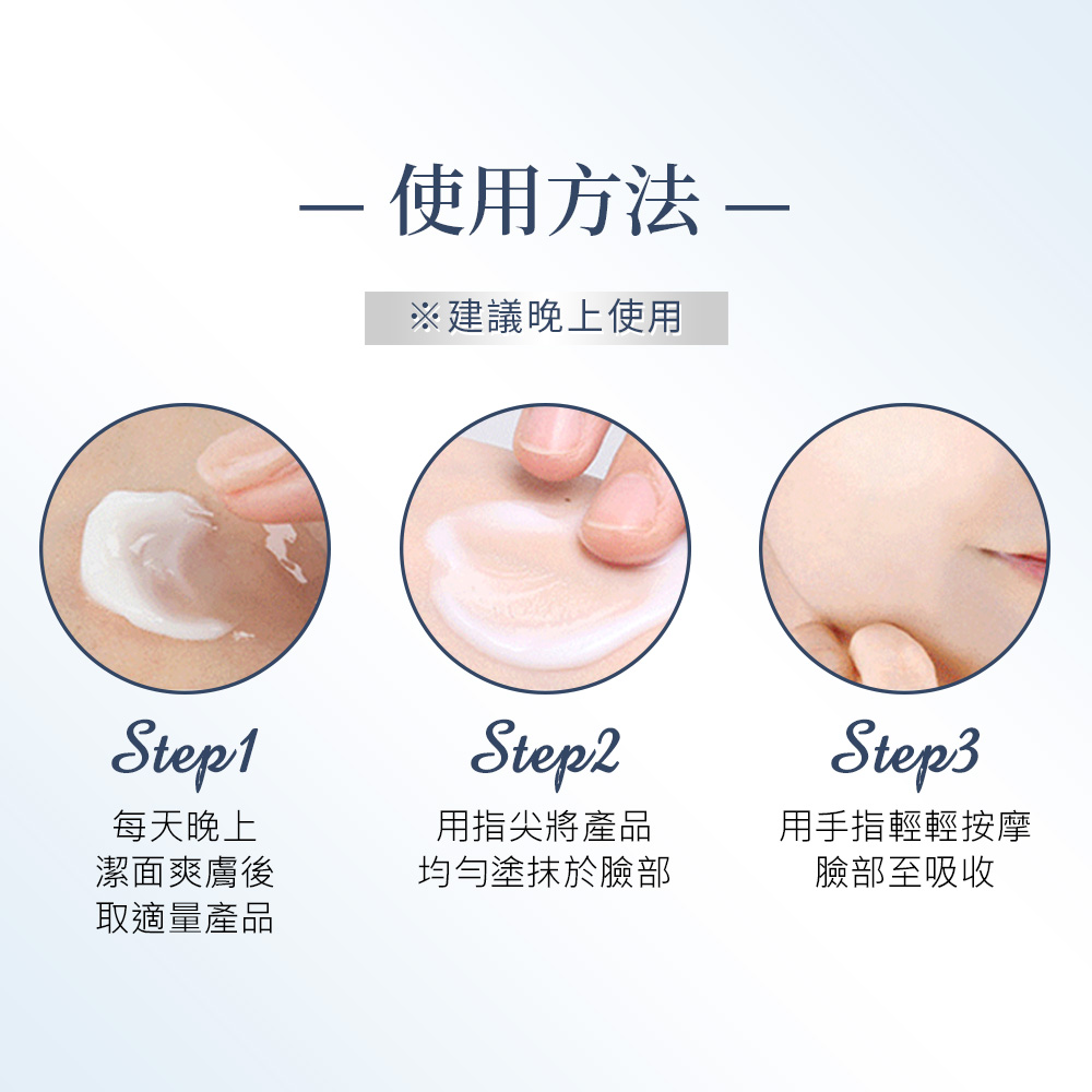 用 法:建議每日早晚取適量於手掌心,均勻塗抹於臉部及頸部肌膚,