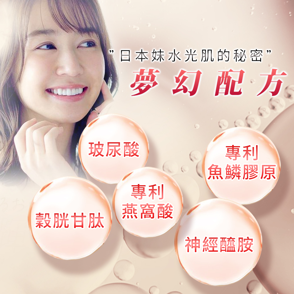成分:微結晶狀α-纖維素、維生素C(抗壞血酸、玉米澱粉)、流行鏈球菌發酵物(含透明質酸鈉)、麥芽糊精、余甘子萃取物、蕃茄籽萃取物(麥芽糊精、蕃茄籽萃取物)、二氧化矽、硬脂酸鎂、穀胱甘肽、魚鱗膠原蛋白粉、玉米胚芽萃取物(含神經醯胺;糊精、玉米胚芽萃取物)、燕窩萃取物(糊精、燕窩萃取物)。膜衣成分:聚乙烯醇、二氧化鈦、聚乙二醇、滑石粉、食用紅色六號、矽酸鋁鉀珠光色素。