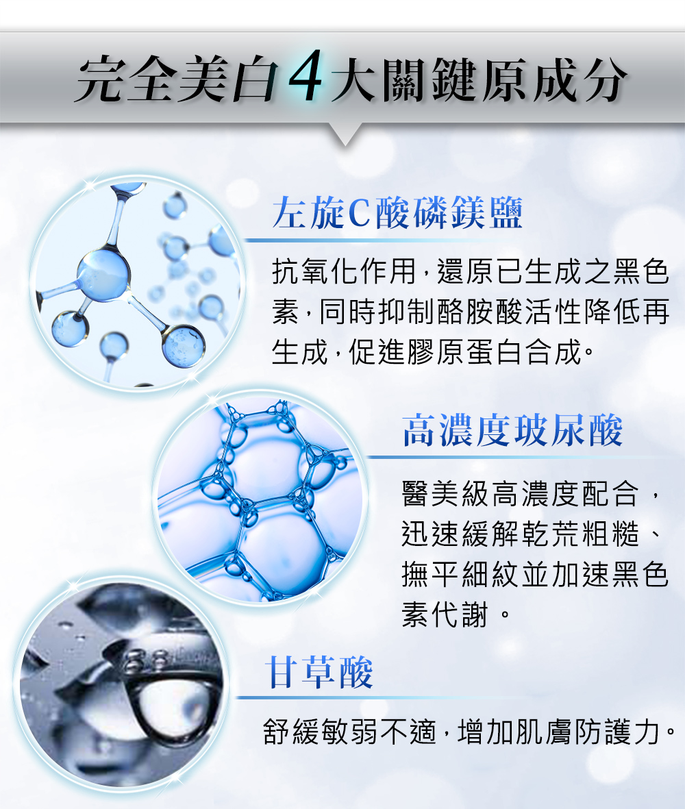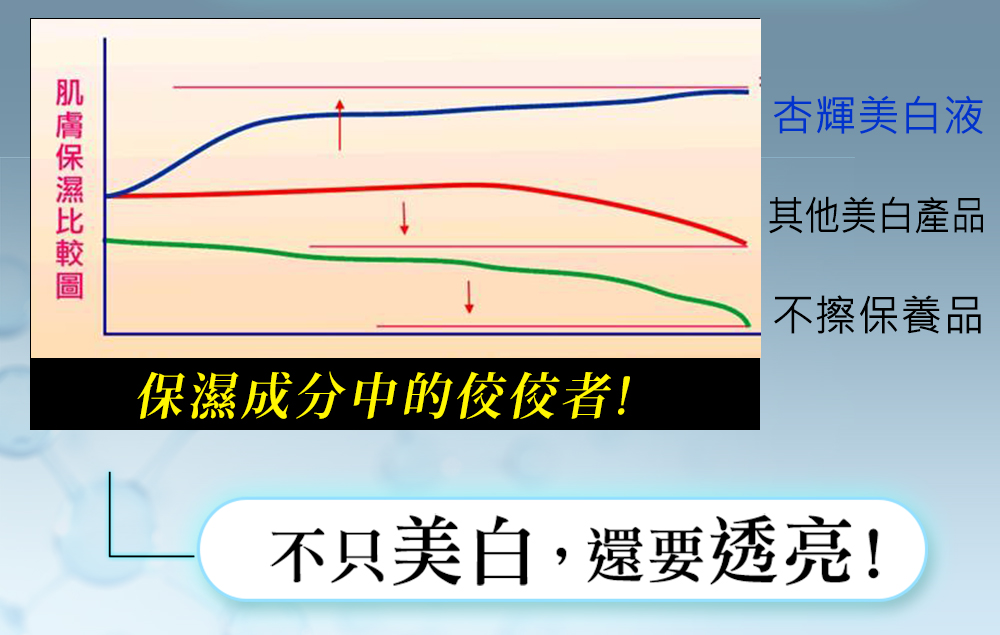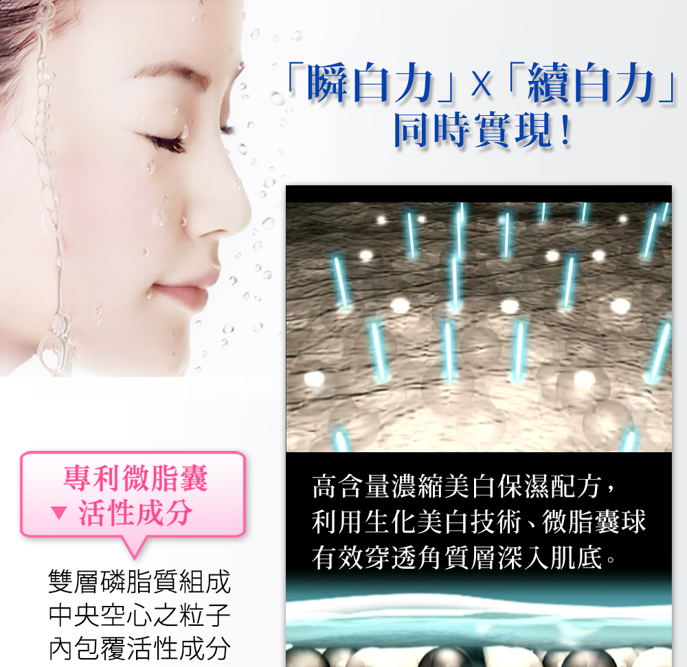 玻尿酸:玻尿酸與高效美白成分在塗抹時使肌膚完成美白&保濕,雙重功效,保溼度提升了,就能一次將美白成分吸收至肌膚底層,只看見驚人的光澤與透明感!美白保濕二合一!